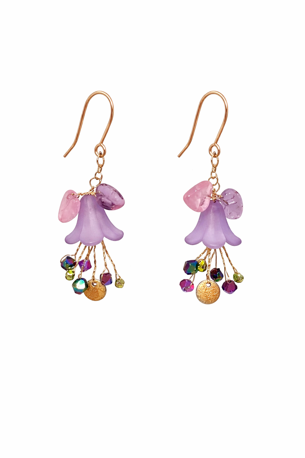 Boucles d’oreilles Acier avec fleur et feuilles en résine rose, perle de verre et cristaux