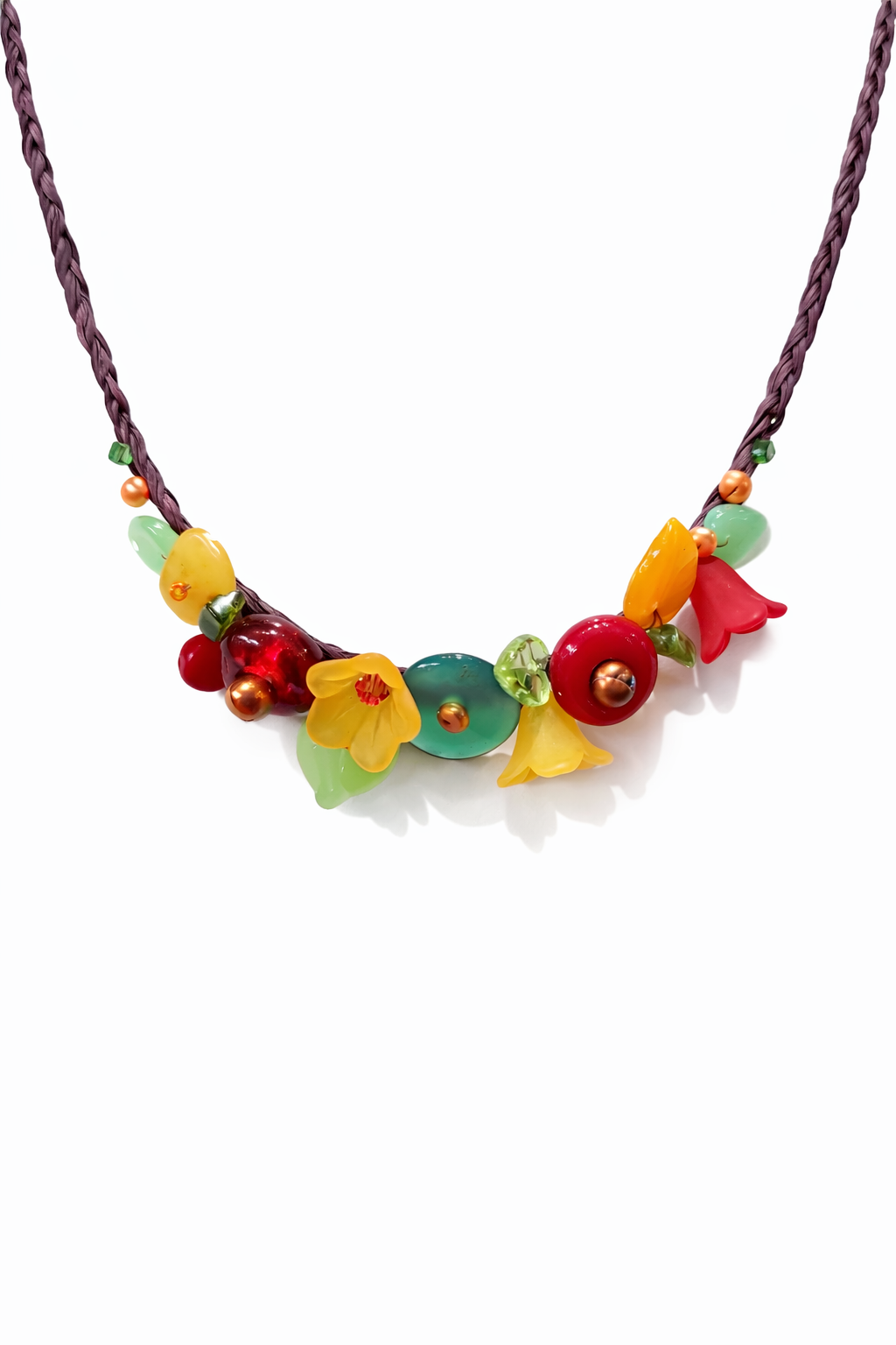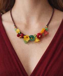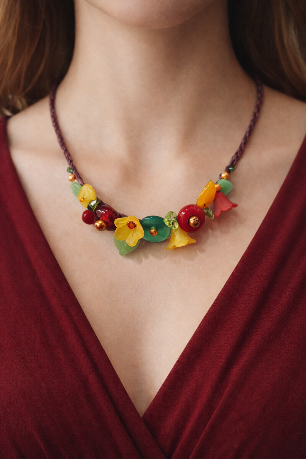Collier en rafia, avec perles de rivière, pierres naturelles, verre,nacre et résine.