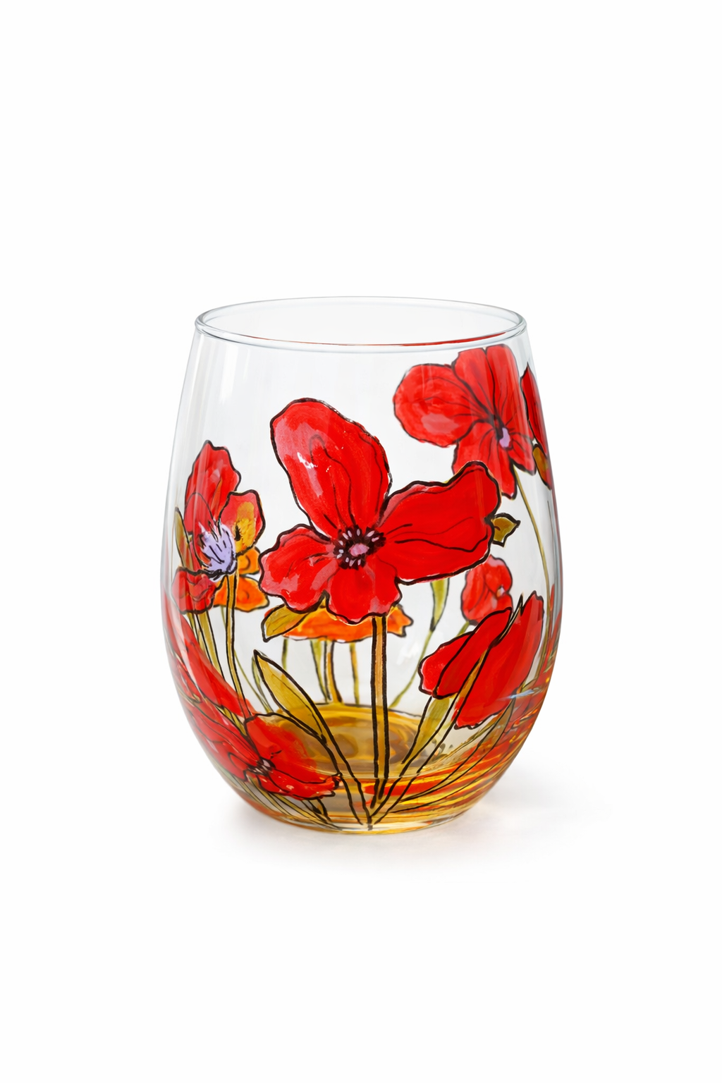 Verre à eau, coquelicots et fleurs jaunes stylés.