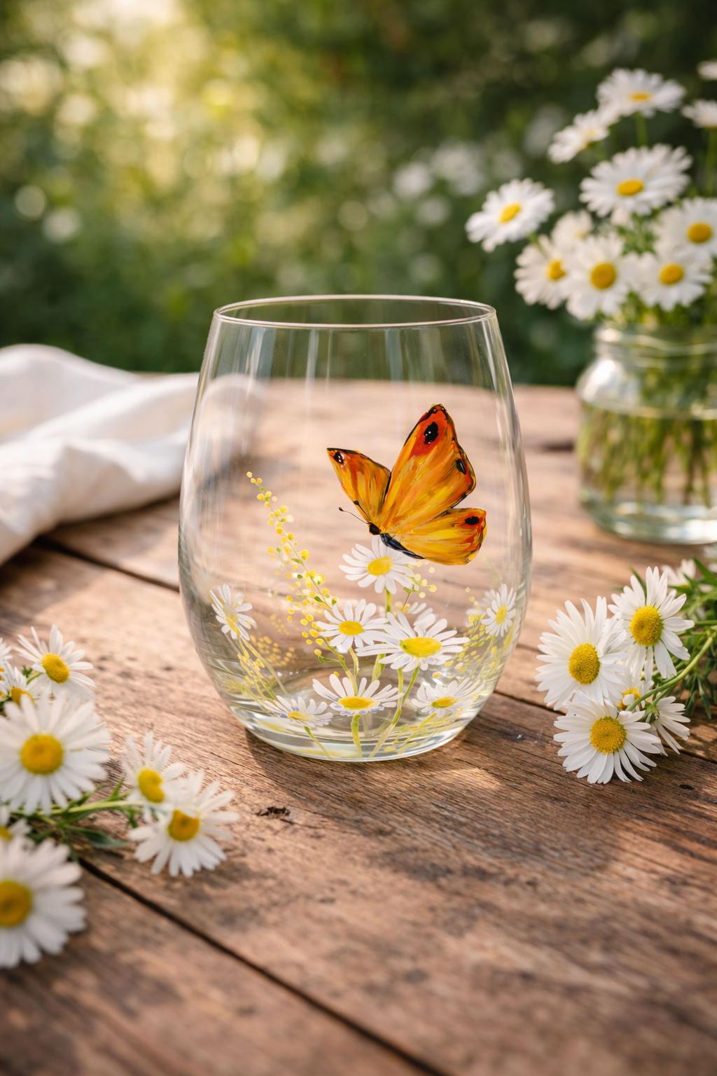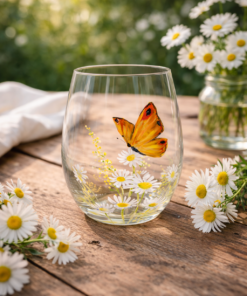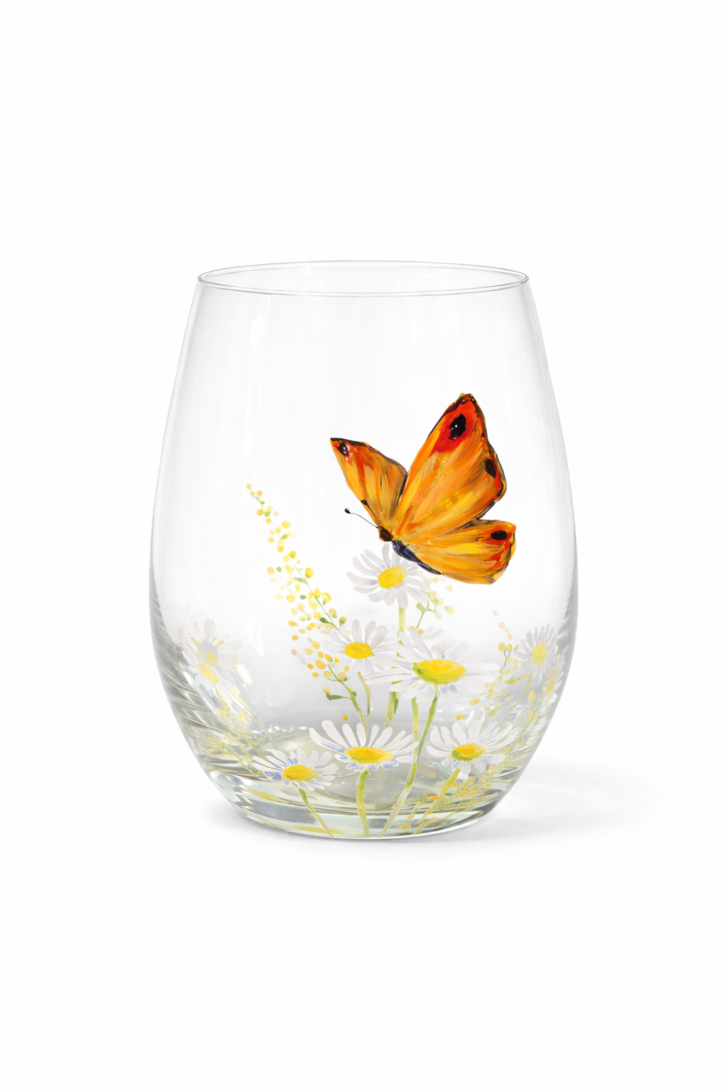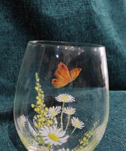 Verre à eau papillon orange et marguerites.
