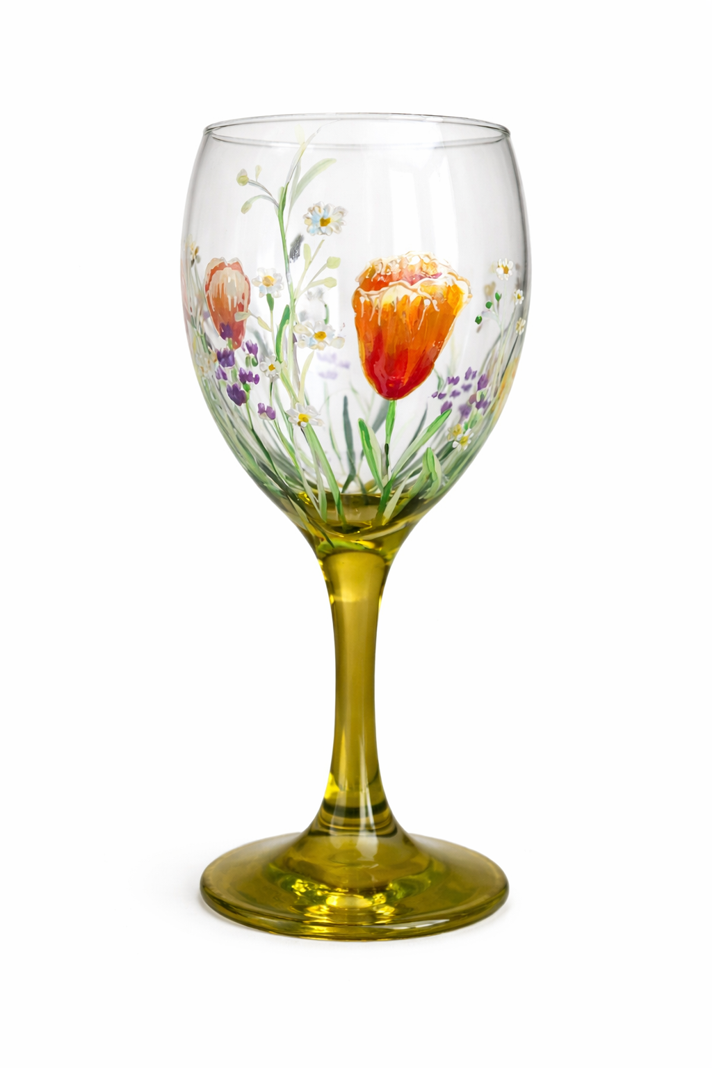 Verre à vin: Fleurs des champs . Tonalité orange, jaune et violet. Pied vert pomme.